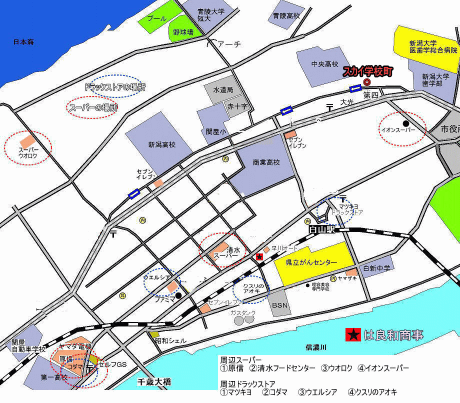 | お店が沢山集まっているエリア 大型スーパーの原信 ヤマダ電機、、ブックオフ、ガストなどなど | 商業高校横のセブン | |