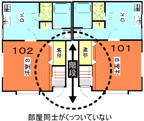 階段を挟んで左右のお部屋 玄関挟んでいるので隣と部屋同士の壁がくっついていないのが良い |