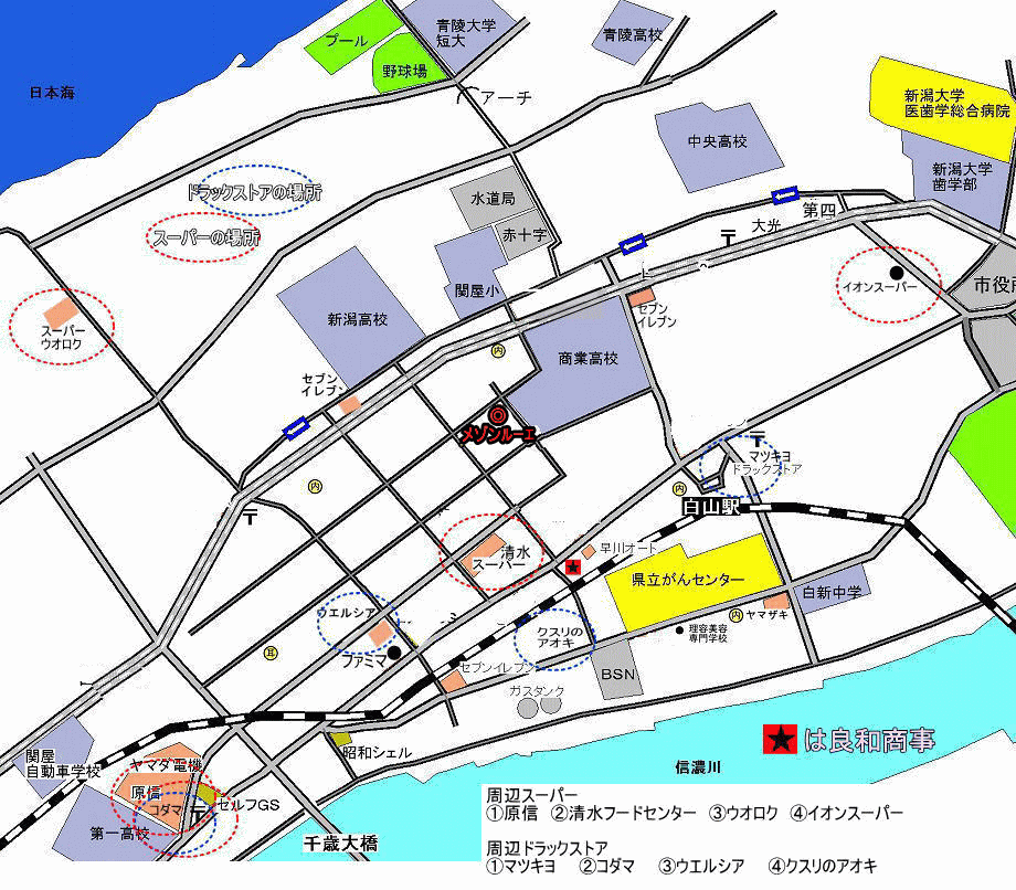 | 新潟高校近く コンビニ | 商業高校近く コンビニ | 白山駅 | |