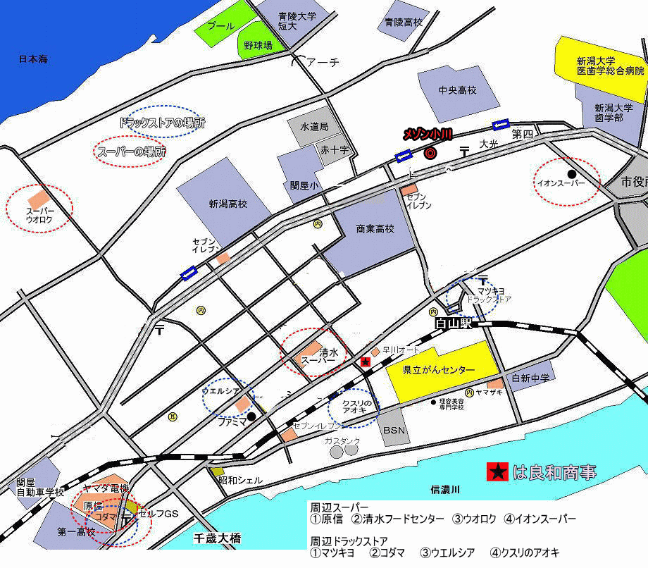 お店が集まっている場所です。 大型スーパーの原信、ヤマダ電機、古本のブックオフ、ドラックストア、100円ショップなどたくさんあります |