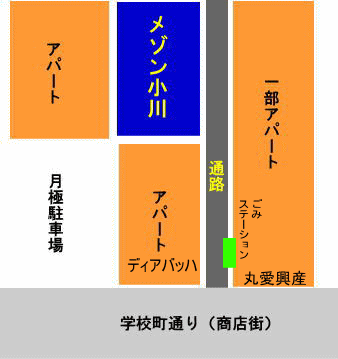 学校町通り商店街から入ります アパート専用のゴミステーション完備で大変楽です |