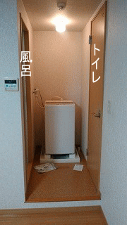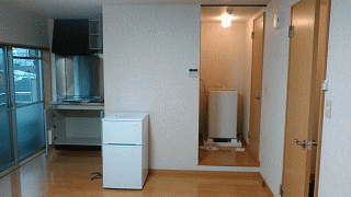 | 小さめな2ドア冷蔵庫・全自動洗濯機が付属 カーテンつければ脱衣所 | ||