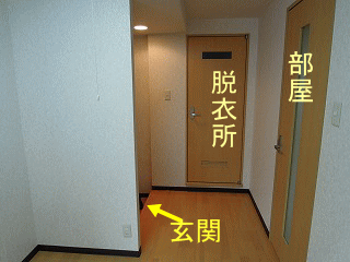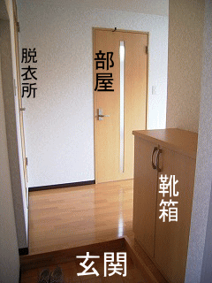 | 玄関横に脱衣所 | 玄関 靴箱あり | 脱衣所から見た図 |